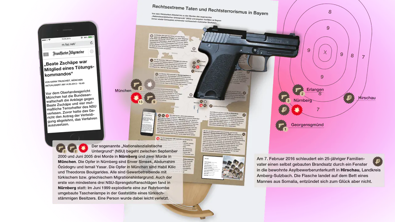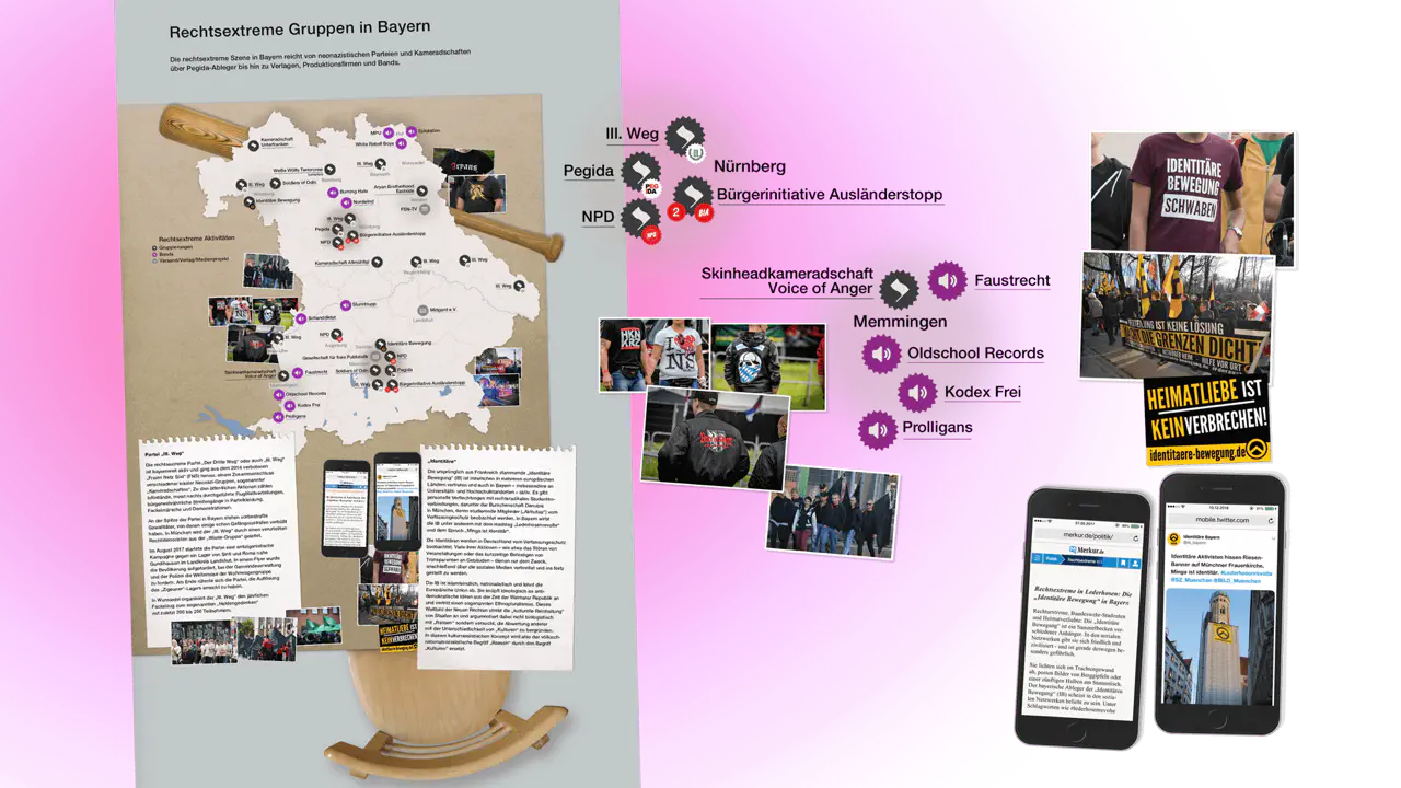 Das Ausstellungsdesign basiert auf der Idee einer fiktiven Person, die Materialien zum Thema „Gegen Rechts“ recherchiert. Die Materialien sind auf verschiedenen Tischen nach Themen geordnet. Das Design erlaubt eine flexible Aktualisierung und kann jederzeit durch neue Ausstellungstafeln zu verschiedenen Themen ergänzt werden. Das Ausstellungsdesign zeichnet sich durch eine anschauliche und leicht zu aktualisierende Gestaltung aus.