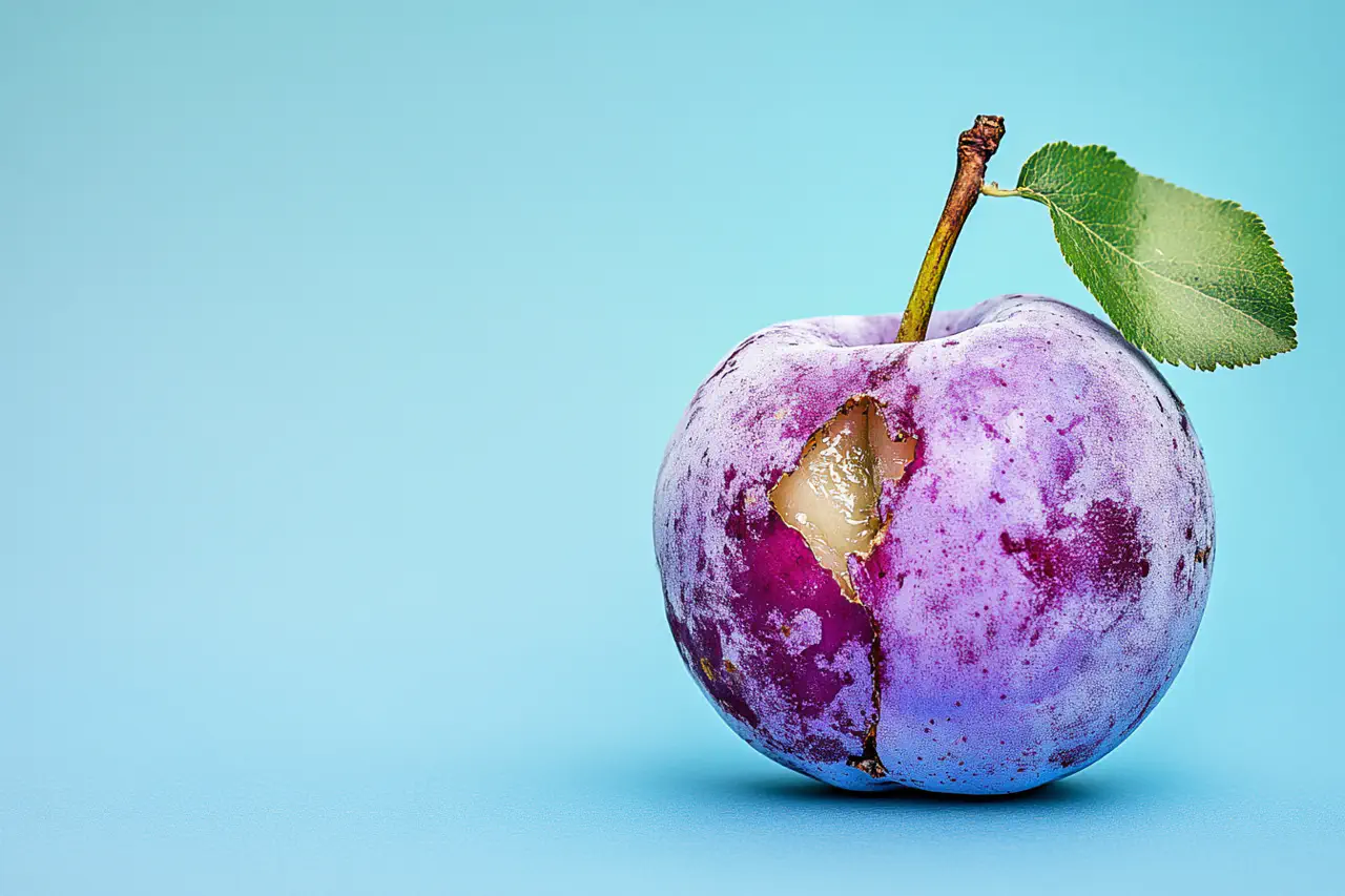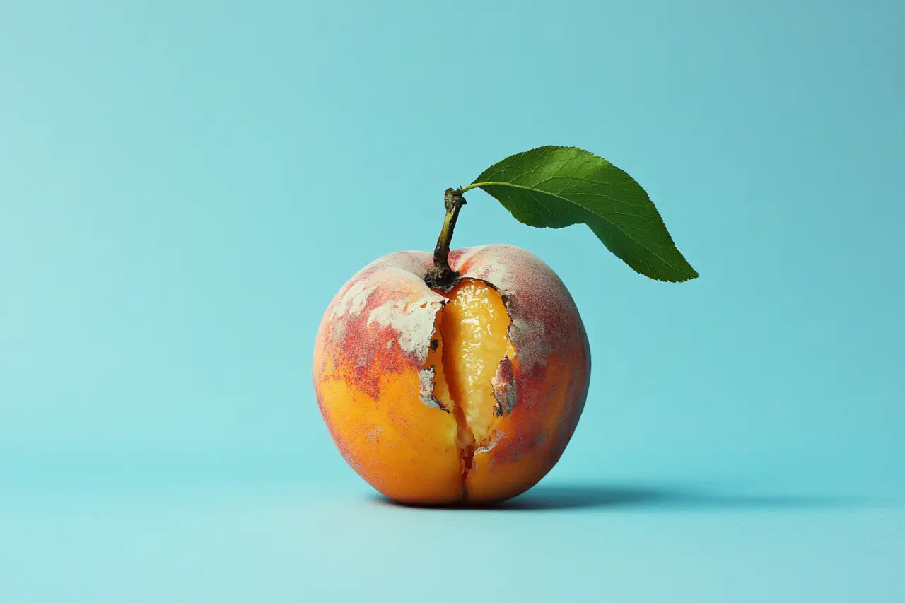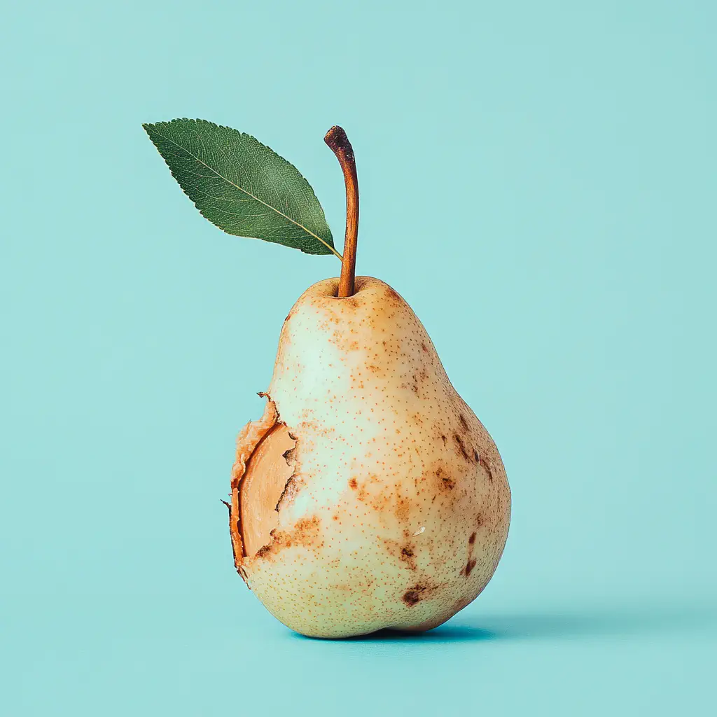 Die Fotografien zeigen verrottende Früchte in verschiedenen Farben vor einem hellen Hintergrund. Die Früchte weisen ein fortgeschrittenes Alter auf und sind auf der rechten Seite angebissen, wodurch das Fruchtfleisch und ein kleiner Teil des Kerns freigelegt wurden. Ein grünes Blatt an einem kurzen Stiel bildet einen auffälligen Kontrast zu den Früchten. Die Haut der Früchte ist rau und trocken. Das Foto ist einfach gehalten, wobei die Frucht im Mittelpunkt steht. Die Kombination von drei Farben macht das Bild lebendig und etwas surreal und lenkt die Aufmerksamkeit auf den Zustand der Früchte und die Bisswunde. Es wurde Blitzlicht verwendet.