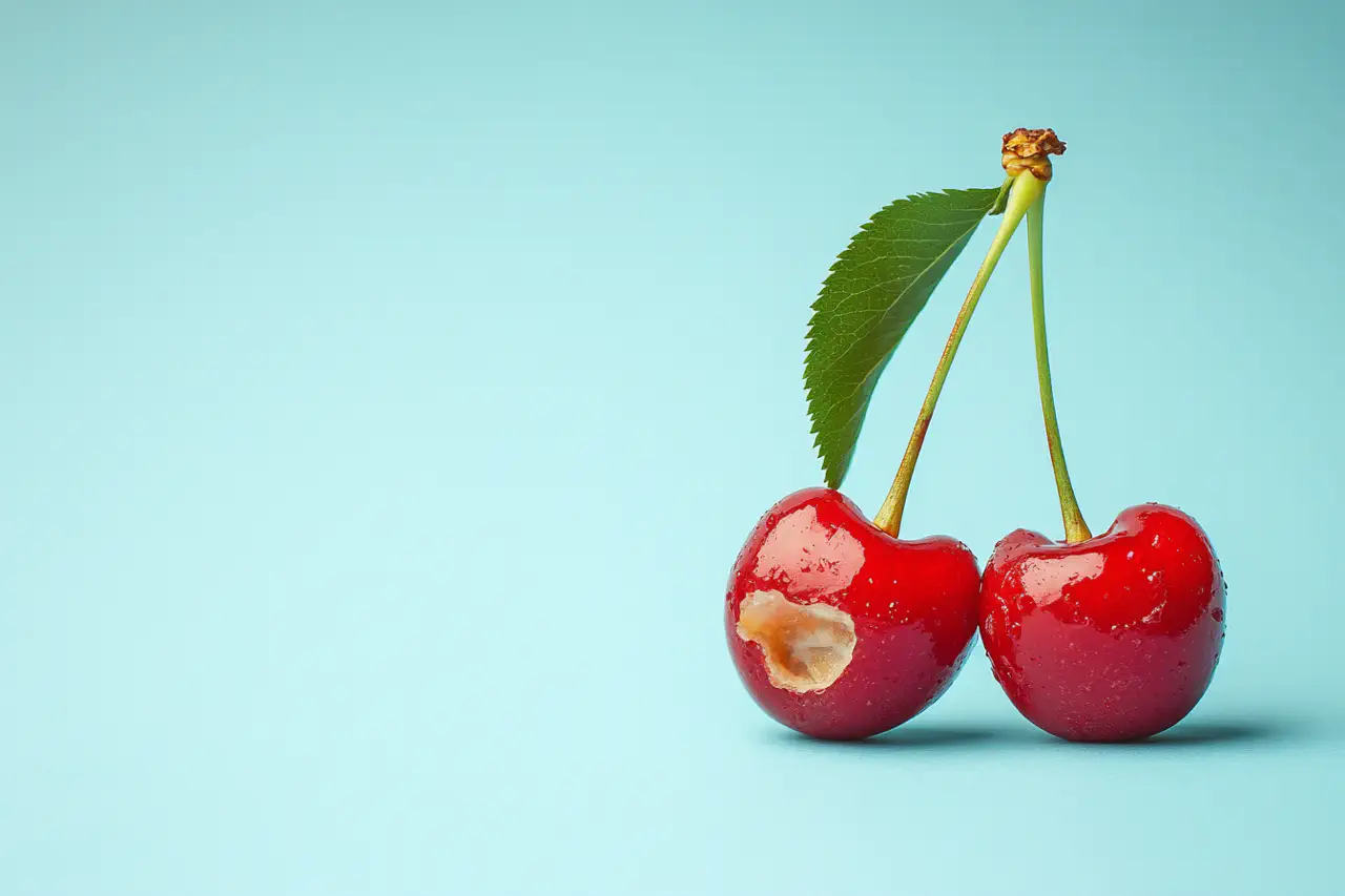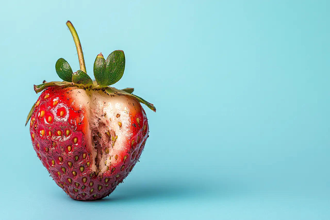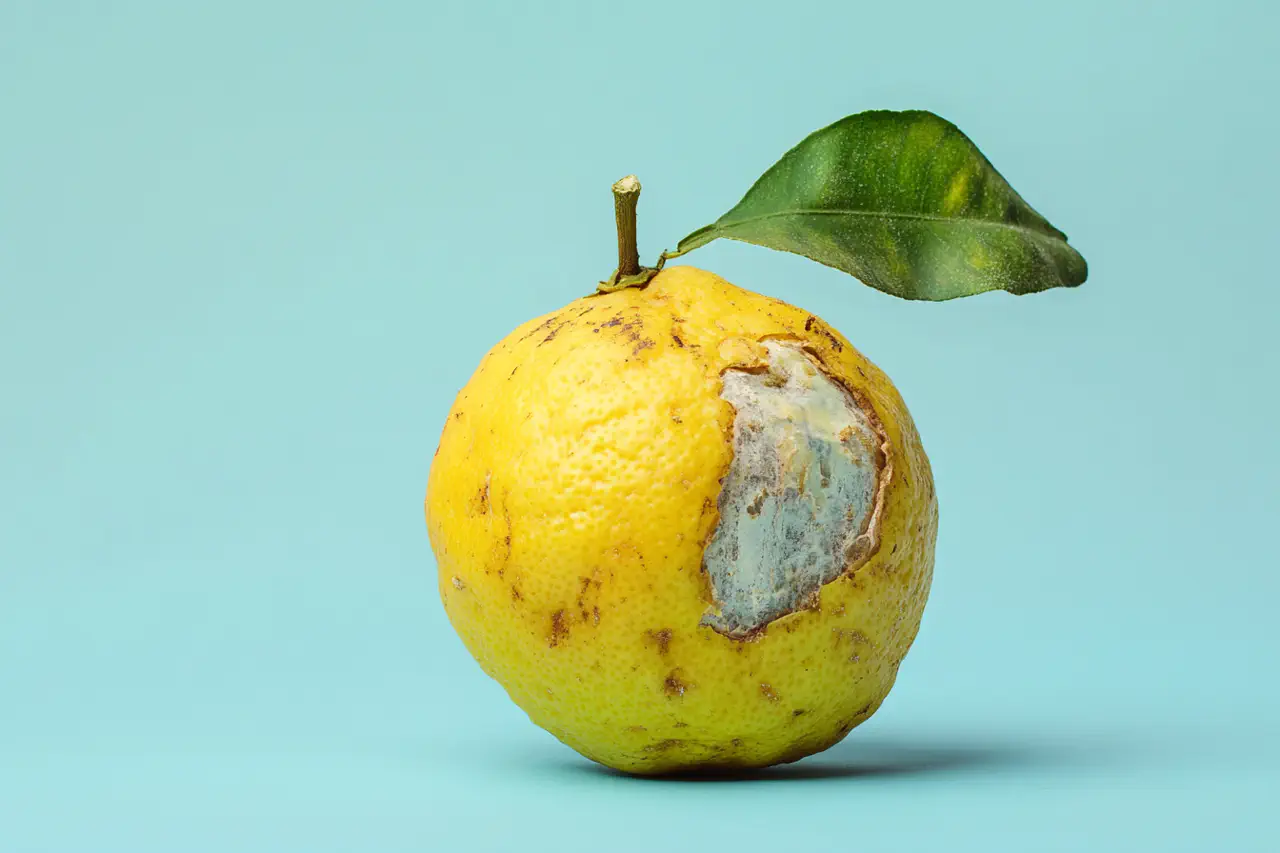 Die Fotografien zeigen verrottende Früchte in verschiedenen Farben vor einem hellen Hintergrund. Die Früchte weisen ein fortgeschrittenes Alter auf und sind auf der rechten Seite angebissen, wodurch das Fruchtfleisch und ein kleiner Teil des Kerns freigelegt wurden. Ein grünes Blatt an einem kurzen Stiel bildet einen auffälligen Kontrast zu den Früchten. Die Haut der Früchte ist rau und trocken. Das Foto ist einfach gehalten, wobei die Frucht im Mittelpunkt steht. Die Kombination von drei Farben macht das Bild lebendig und etwas surreal und lenkt die Aufmerksamkeit auf den Zustand der Früchte und die Bisswunde. Es wurde Blitzlicht verwendet.