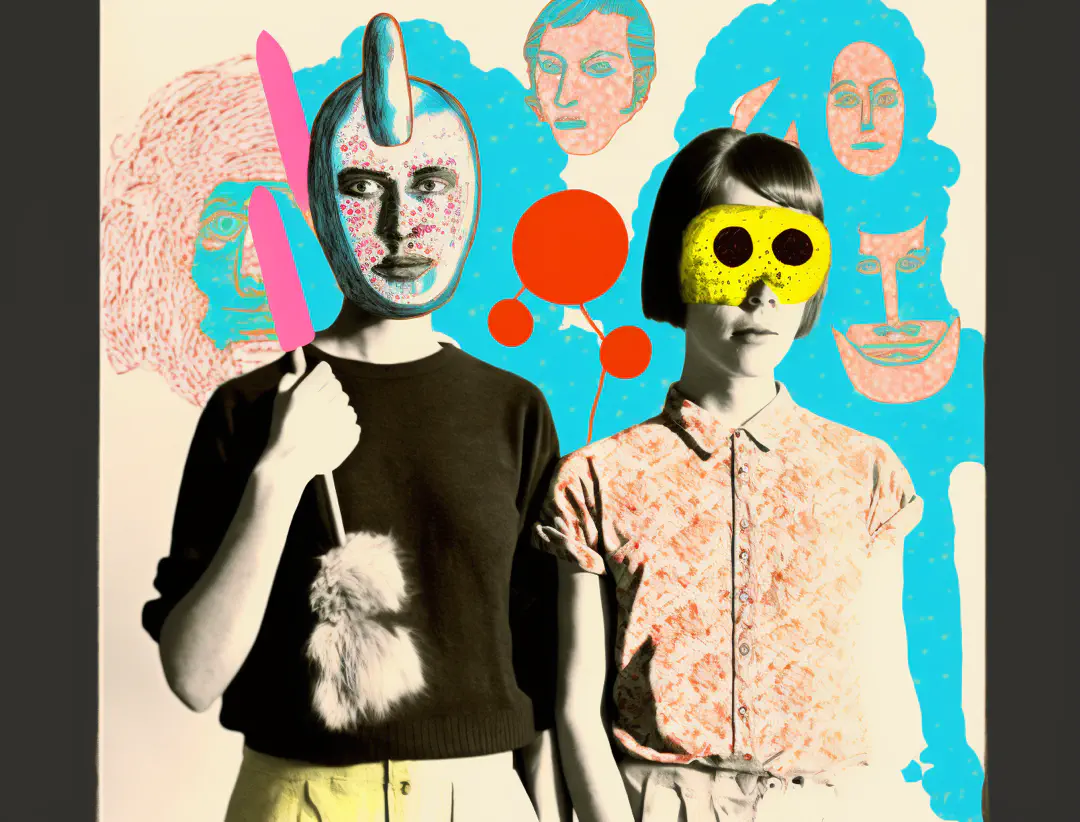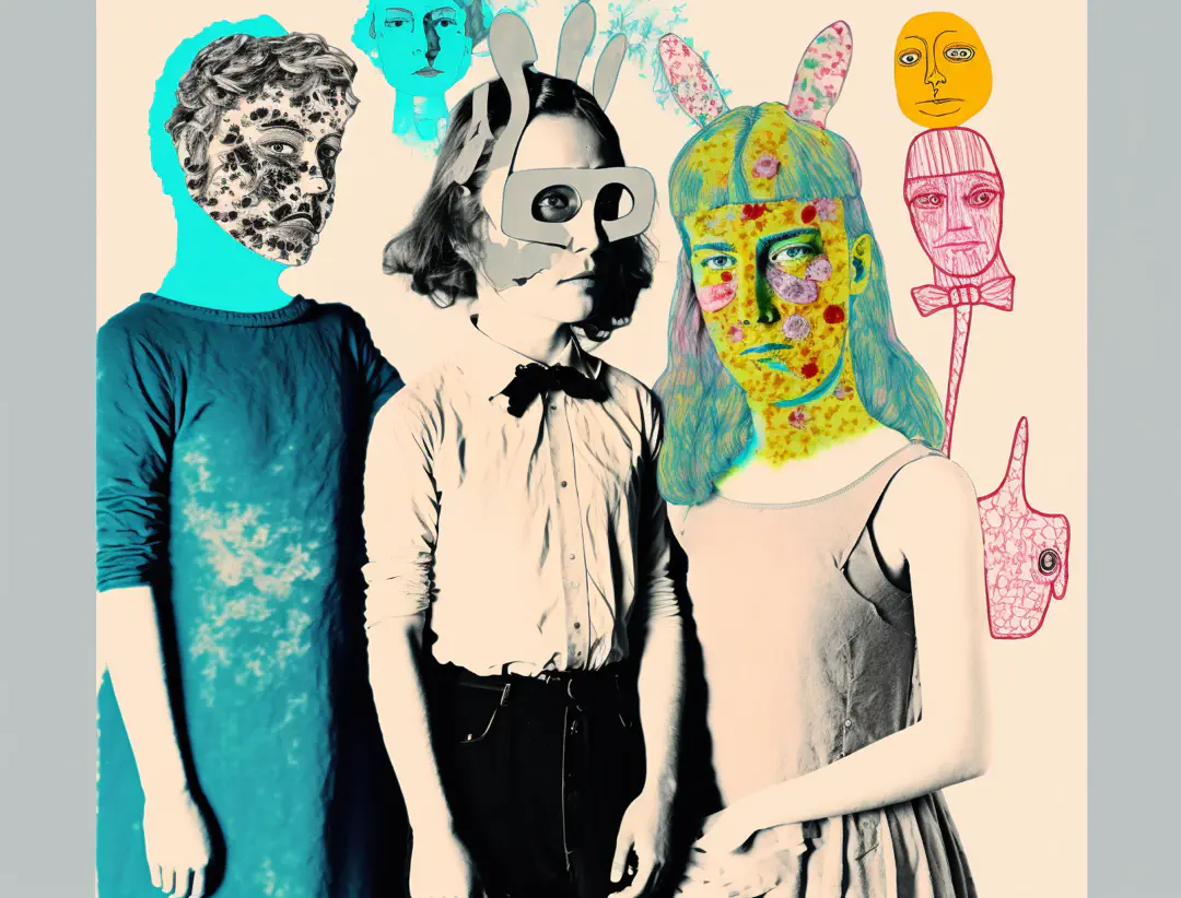 Positive secrets and dreams of [young] adults with disabilities in a friendly playful atmosphere, lively and energetic, surrealist pop art collage, reflection, shadows, superimposed graphics, overlay of photos and hand drawing, muted vivid bubblegum pastel highlights, zenit with svema foto 64 film, 2000s