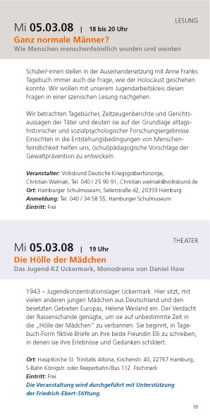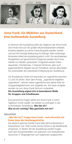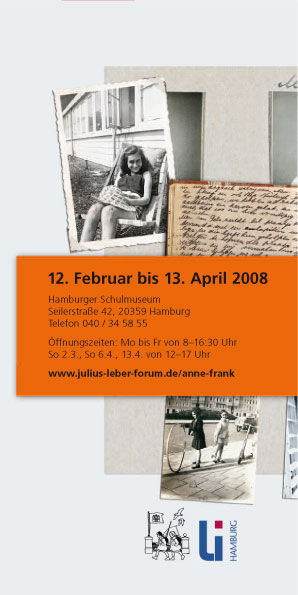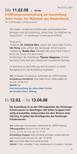 Das Julius-Leber-Forum der Friedrich-Ebert-Stiftung präsentierte zusammen mit dem Hamburger Schulmuseum die multimediale Ausstellung „Anne Frank. Ein Mädchen aus Deutschland“, begleitet von einem facettenreichen Rahmenprogramm. Das umfangreiche Programmheft wurde von uns gestaltet.