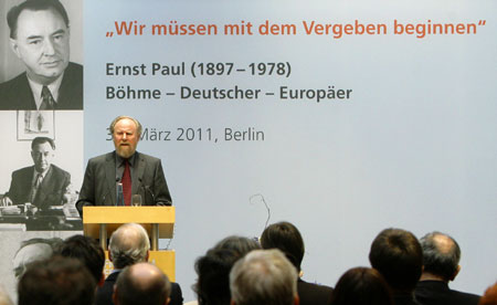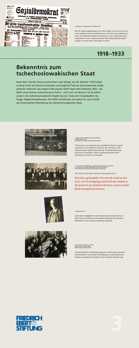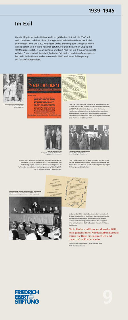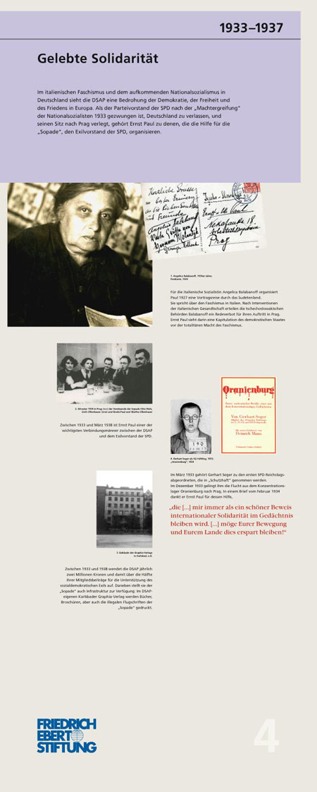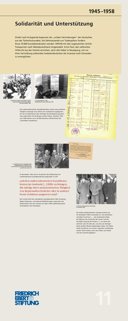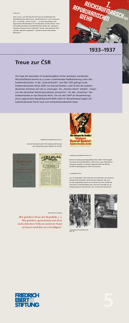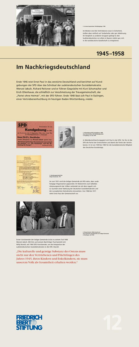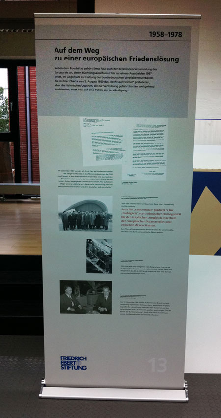 „Wir müssen mit dem Vergeben beginnen – Ernst Paul: Böhme, Deutscher, Europäer“ (1897 – 1978): Die Ausstellung schildert exemplarisch am Leben Ernst Pauls die Geschichte der sudentendeutschen Arbeiterbewegung. Die 16 Tableaus dokumentieren seinen politischen Werdegang, seine Vision einer deutsch-tschechischen Partnerschaft und einem gemeinsamen Europa. IconScreen gibt der in zwei Sprachen erstellten Ausstellung ein durchgängiges Design. Ein Katalog begleitet die Ausstellung.