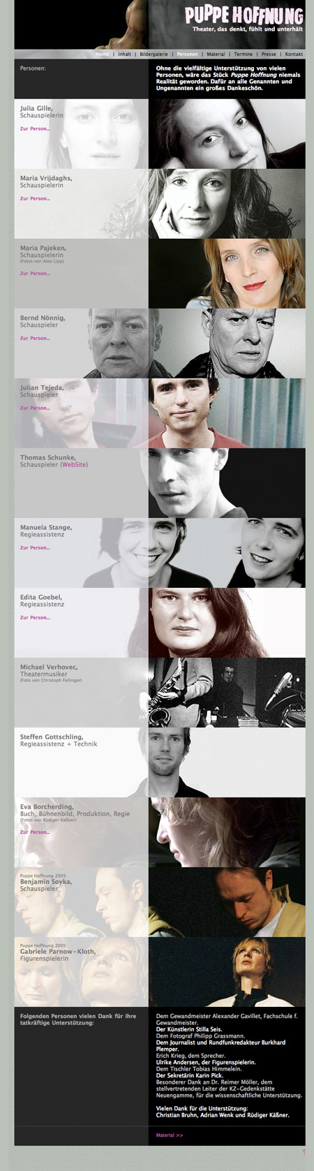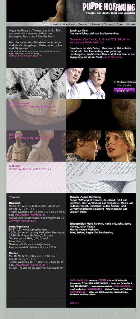 Puppe Hoffnung ist Theater, das denkt, fühlt und unterhält – eine Verbindung aus Schauspiel, Musik und Bildender Kunst. Überleben in den Arbeits- und Vernichtungslagern Hamburg-Neuengamme und Sobibór, Polen. Dokumentarisches und Fiktionales. Diese ungewöhnliche Inszenierung wird auf der WebSite vorgestellt.