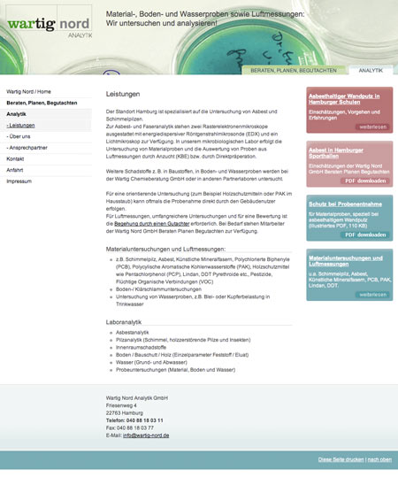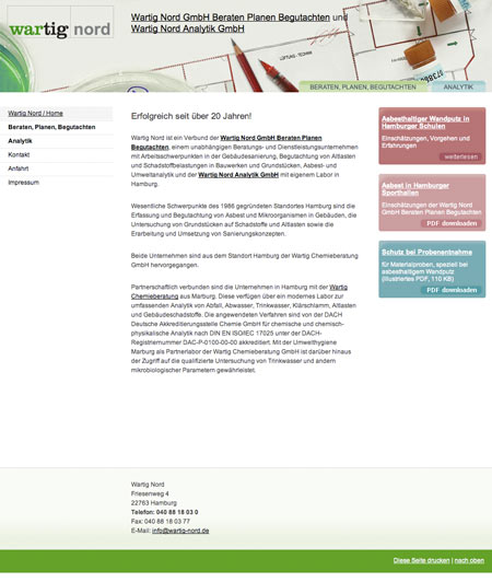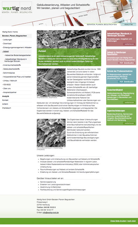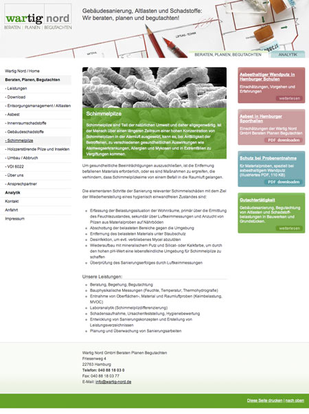 Zwei Unternehmen – ein gemeinsamer Internetauftritt: zum einen das unabhängige Beratungs- und Dienstleistungsunternehmen für Gebäudesanierung, Umweltanalytik und Begutachtung. Zum anderen die Analytik von Schadstoffen in Baustoffen, Materialuntersuchungen, Bodenproben und Luftmessungen. Die gestalterische Lösung dazu entwarf IconScreen.