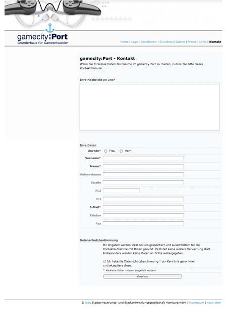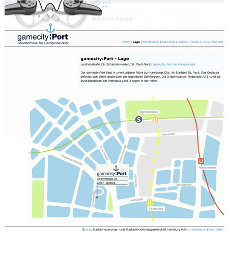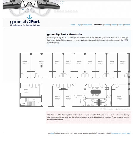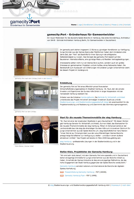 WebDesign und Grafik für das erste Gameentwickler-Gründerhaus in Deutschland: GameCity Port, Hamburg. Büros zu günstigen Konditionen für junge Selbstständige aus der Games-Szene. Das Konzept des GameCity Port basiert auf drei Bausteinen: Kleinstbürofläche, eine günstige Miete und flexible Vertragsbedingungen.