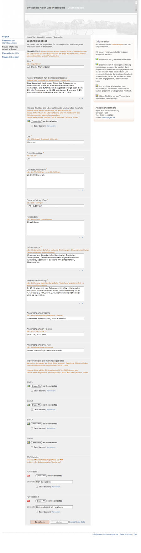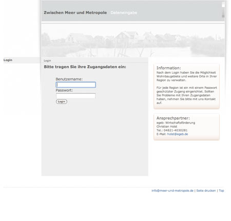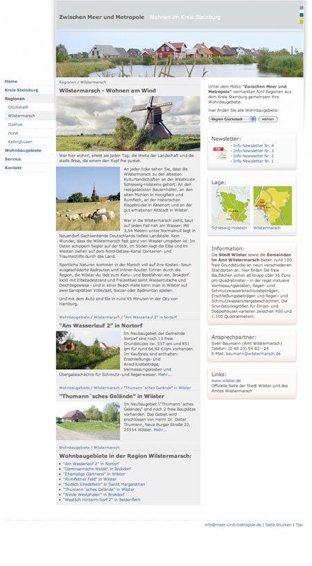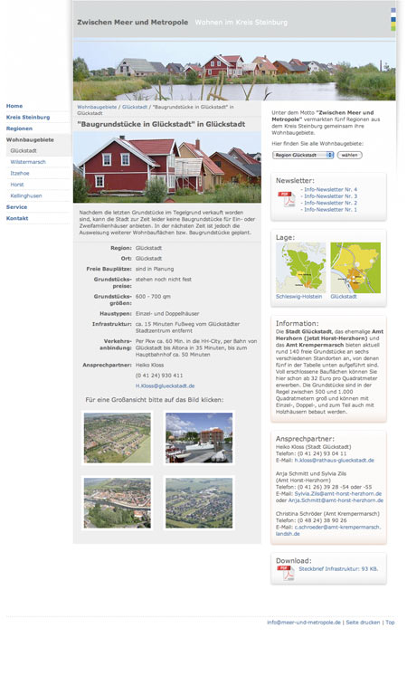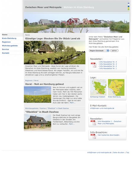 Unter dem Motto „Zwischen Meer und Metropole“ vermarkten sechs Regionen aus dem Kreis Steinburg gemeinsam ihre Wohnbaugebiete. Die WebSite ist in Anlehnung an die bestehende Broschüre gestaltet. Entstanden ist ein gelungener Medien-Mix unter einem Dach.