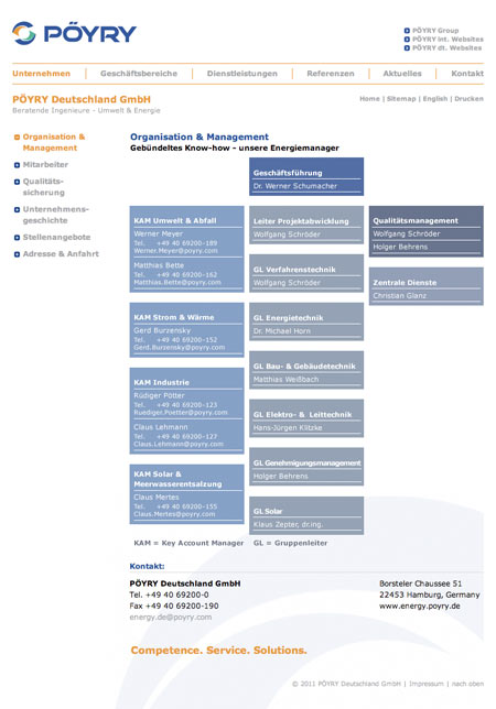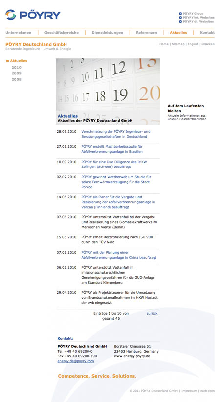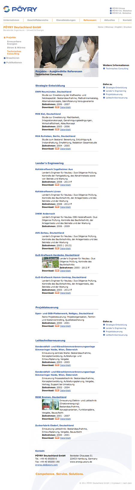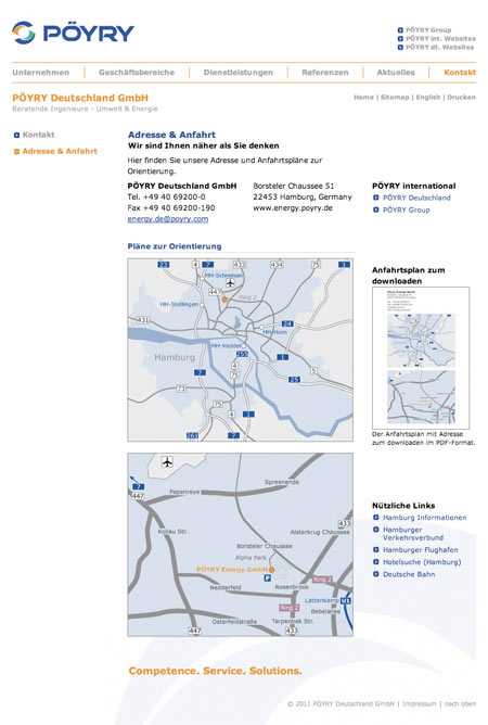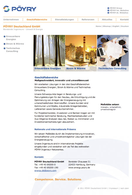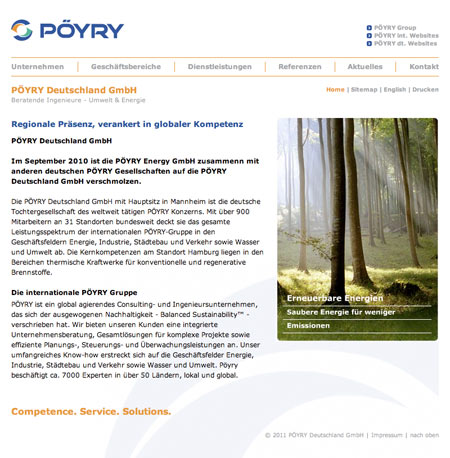 Die PÖYRY Energy GmbH Hamburg ist eine Tochtergesellschaft des weltweit tätigen PÖYRY Konzerns. Die Schwerpunkte sind Beratungs- und Planungsleistungen für Erneuerbare Energien, Strom & Wärme und Technisches Consulting. Angelehnt an das Coporate Design der PÖYRY Group präsentiert sich die Unternehmensdarstellung im zeitgemäßen Look.