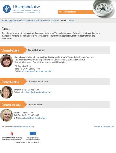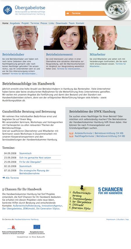 Die zentrale Beratungsstelle für Betriebsübernahmen ist der neue kompetente Service für Handwerksbetriebe mit Übergabeabsichten. Für den „Übergabelotsen“, ein ESF-Projekt der Handwerkskammer Hamburg, gestaltete und erstellte IconScreen eine eigenständige Internetseite.