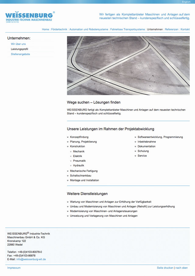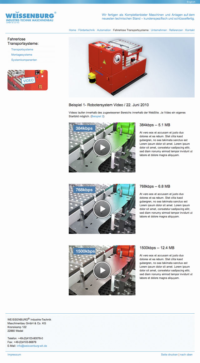 WEISSENBURG Industrie-Technik und Maschinenbau: Das Unternehmen ist ein Generalanbieter in den Bereichen Fördertechnik, Automatisierungstechnik und Fahrerlose Transportsysteme (FTS). Auf der HomePage sind diese Projektgruppen plakativ in Szene gesetzt. Ansprechende Fotografien und kurze Anreißer-Texte (Teaser) machen neugierig auf die weiteren Inhalte.