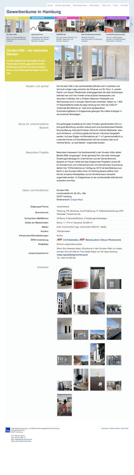 Eine Gewerberaumbörse und ein Newsletter ergänzen das aktuelle Angebot. Kräftige Farben heben die einzelnen Projekte hervor, das Gestaltungsraster strukturiert die Projektdaten übersichtlich. Die WebSite lässt sich komfortabel pflegen mit einem bereits bewährten CMS.