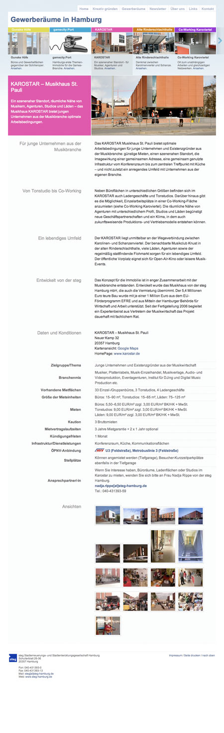 St. Pauli und die Sternschanze sind Hamburgs hot spot für Existenzgründungen. Die steg bietet jungen Unternehmen und Start-ups hier günstige Gewerberäume zu flexiblen Konditionen an. Diese innovativen Gründerzentren werden mit ausführlichen Bilddokumentationen und positiven Stimmen der Gründer vorgestellt. IconScreen gestaltet den Relaunch der WebSite.
