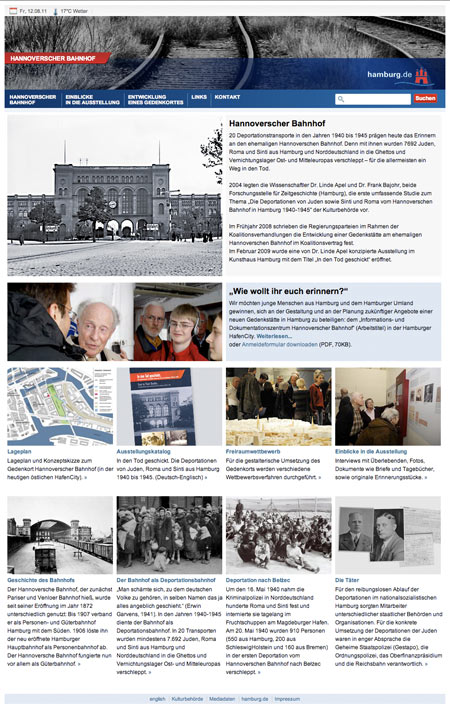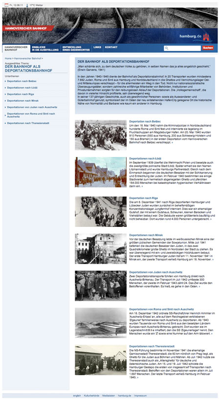 Der Hannoversche Bahnhof als Deportationsbahnhof in der Nazi-Zeit wurde in der Geschichte Hamburgs bisher kaum thematisiert. Eine Ausstellung im Auftrag der Kulturbehörde, in Zusammenarbeit mit der Forschungsstelle für Zeitgeschichte in Hamburg und der KZ-Gedenkstätte Neuengamme, nahm sich diesem Thema an. Die von uns erstellte und betreute Website bietet die Geschichte der Deportationen von Juden, Roma und Sinti aus Hamburg 1940–1945 und begleitet die Ausstellung, auch mit multimedialen Elementen.