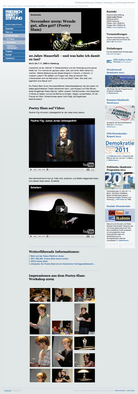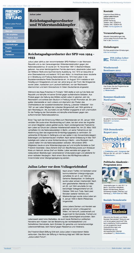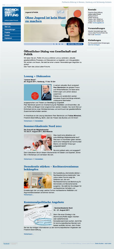 Für die WebSite des Julius-Leber-Forums der Friedrich-Ebert-Stiftung setzte IconScreen den grafischen und inhaltlichen Relaunch um. Wir freuen uns diese Aufgabe erneut zu übernehmen. Ausgehend vom Corporate Design und den Bedürfnissen des Hamburger Büros, wird das zentrale Angebot des Julius-Leber-Forums visualisiert: „Öffentlicher Dialog von Gesellschaft und Politik“.