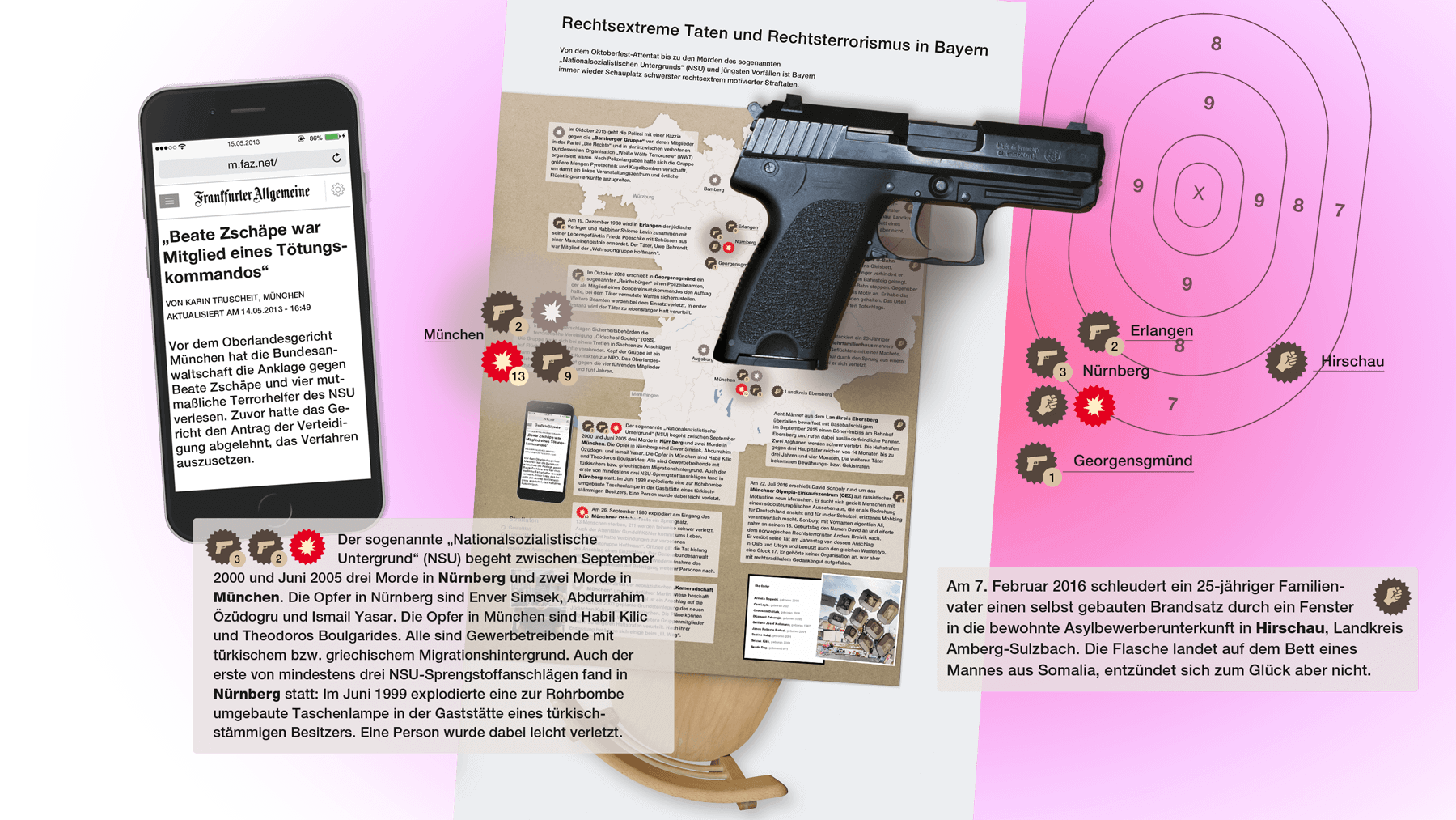 Die Grundidee für das Design der Ausstellung: Eine fiktive Person recherchiert Materialien »Gegen Rechts«, die nach Themen auf verschiedenen Tischen arrangiert sind. Das Design erlaubt ein flexibles Aktualisieren, ist anschaulich und kann jederzeit durch thematisch neue Ausstellungstafeln ergänzt werden.