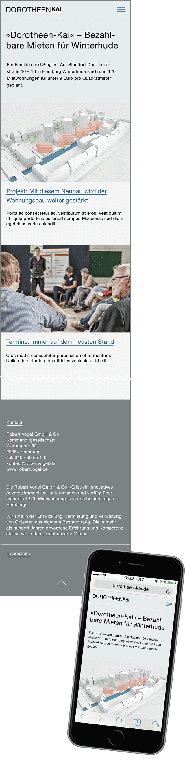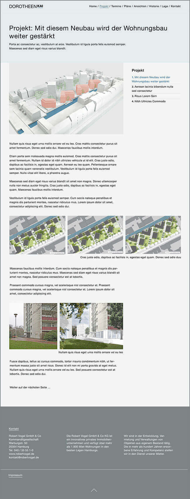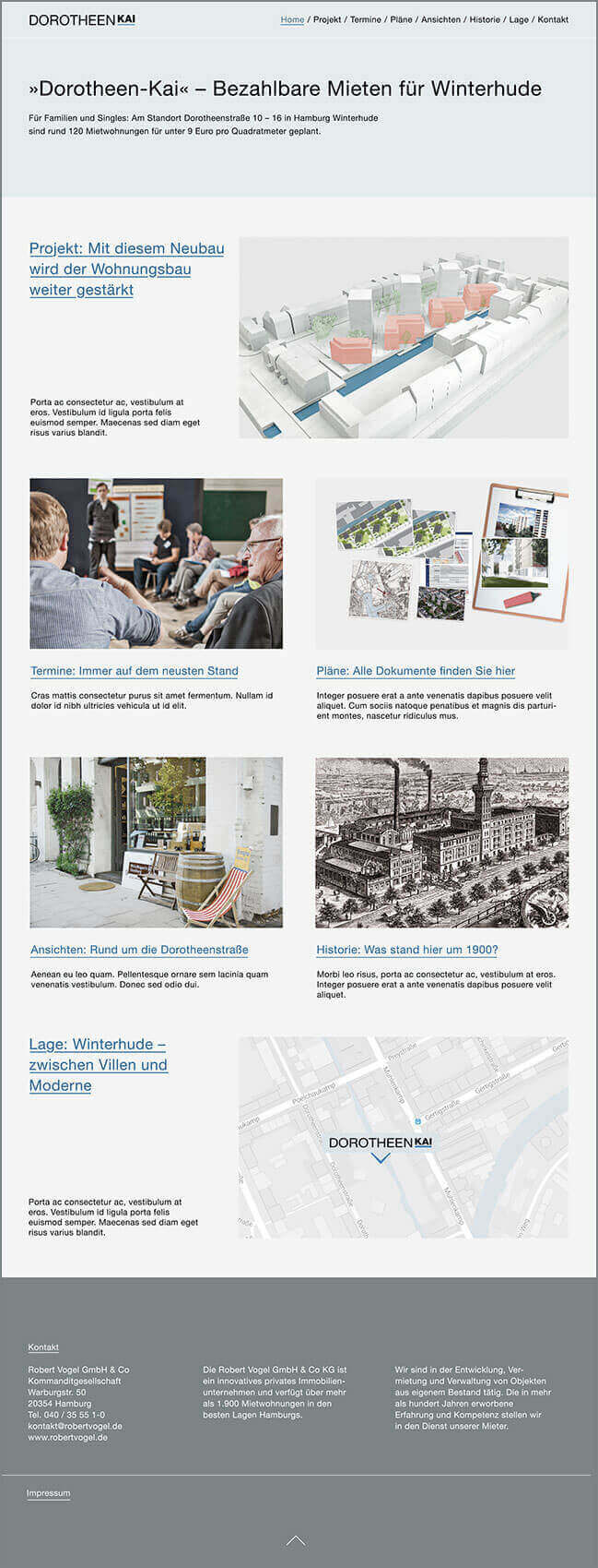 Mit dem Projekt Dorotheenkai will das Hamburger Wohnungsunternehmen Robert Vogel bezahlbaren Wohnraum in Hamburg-Winterhude schaffen. Die Website sollte in einem stadtspolitisch umstrittenen Diskurs, die Sicht und Pläne des Unternehmens sachlich und informativ darstellen. Zur Historie der Dorotheenstraße gehört es, dass dort 1960/1961 im Zuge der Nachkriegsmoderne die bis heute charakteristischen Hochhäuser entstanden sind. Das Umfeld dieser Hochhäuser soll bebaut werden.