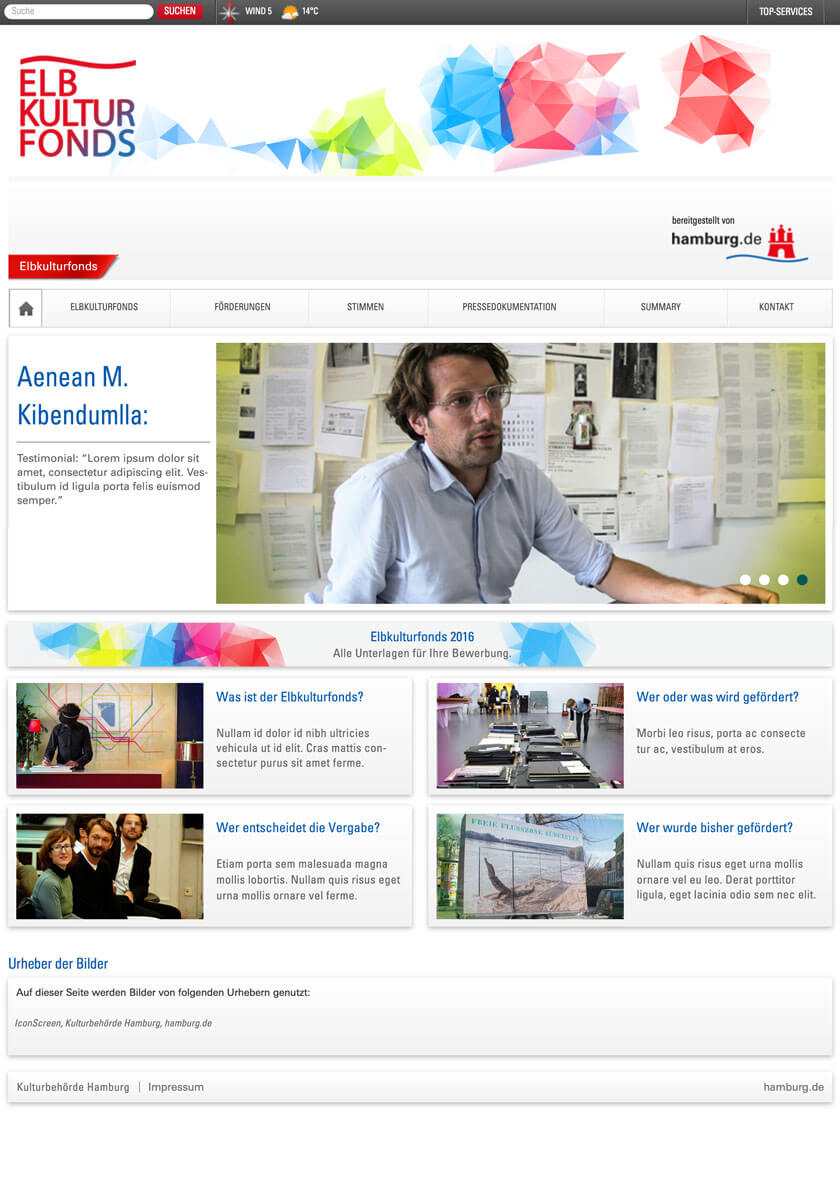 Im Sommer 2015 wurde IconScreen gefragt, ob wir die Website zum Elbkulturfonds innerhalb des städtischen CMS CoreMedia betreuen wollen. Das taten wir gerne: Herausgekommen ist eine schöne, zurückhaltende Website, die den Projekten der Geförderten den nötigen Raum gibt.
