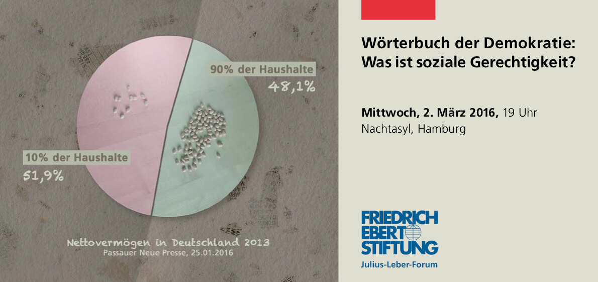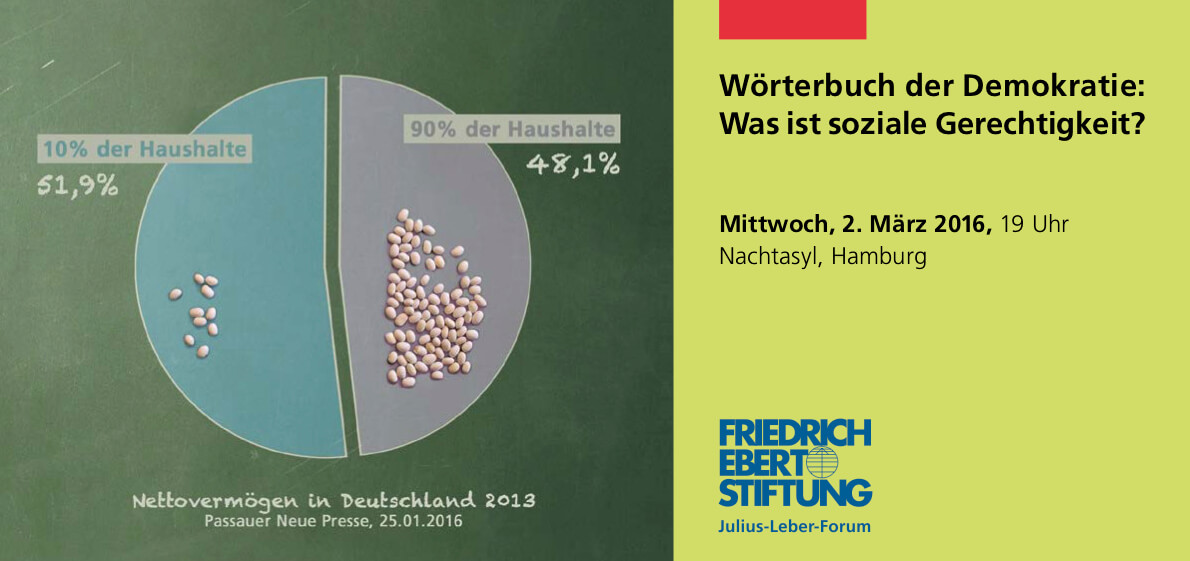 Soziale Gerechtigkeit als Flyermotiv: Verteilung des Nettovermögens in Deutschland am Beispiel von abgezählten Bohnen, als Würfelmotiv oder als Inhalt eines Portemonnaies.