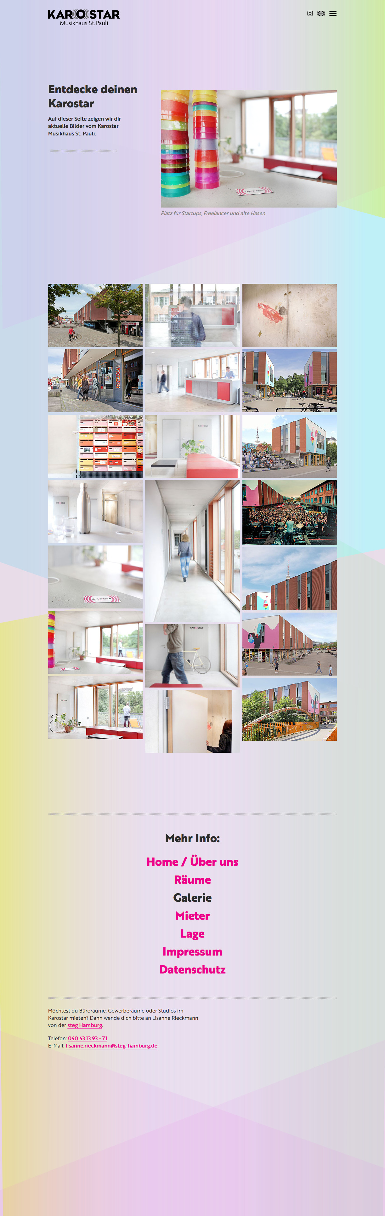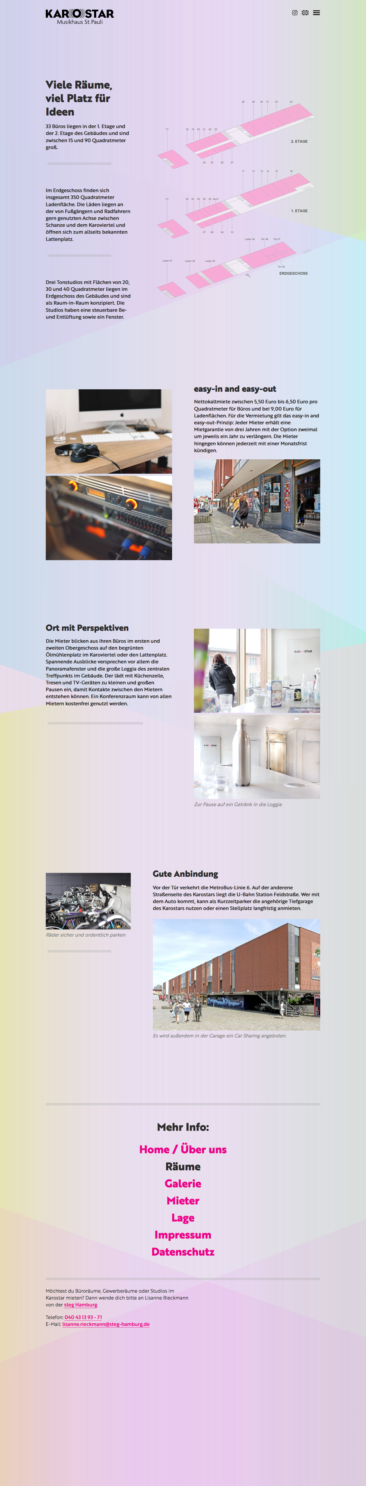 Die Themenimmobilie Karostar der steg Hamburg ist der Inkubator im Karoviertel für die Musikbranche: Musiker, Label-Macher, PR-Agenturen, Produktionsfirmen und Kreative auf über 2000 Quadratmetern mitten im Szene-Herzen der Hansestadt Hamburg, im Karoviertel.